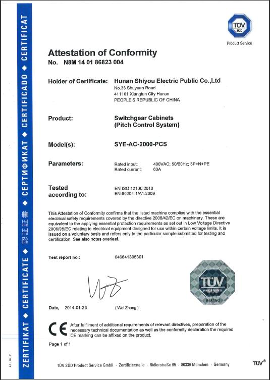 經世界權威認證機構德國TUV的嚴格評審,世優電氣風力發電機組電控系統全系列產品榮獲歐盟CE認證。